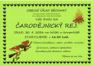 OBECNÍ ÚŘAD BĚCHARY VE SPOLUPRÁCI S MÍSTNÍMI SPOLKY, SDH, BĚCHARÁCI, SPORTOVNÍ RYBÁŘI VÁS ZVOU NA ČARODĚJNICKÝ REJ. SRAZ: 30. 4. 2026 na hřišti u koupaliště STARTUJEME: v 16.30 hod. Pálení čarodějnic, vatra, soutěže, muzika. Grilovaní, opékání špekáčků. Čarodějnické oblečení vítáno.