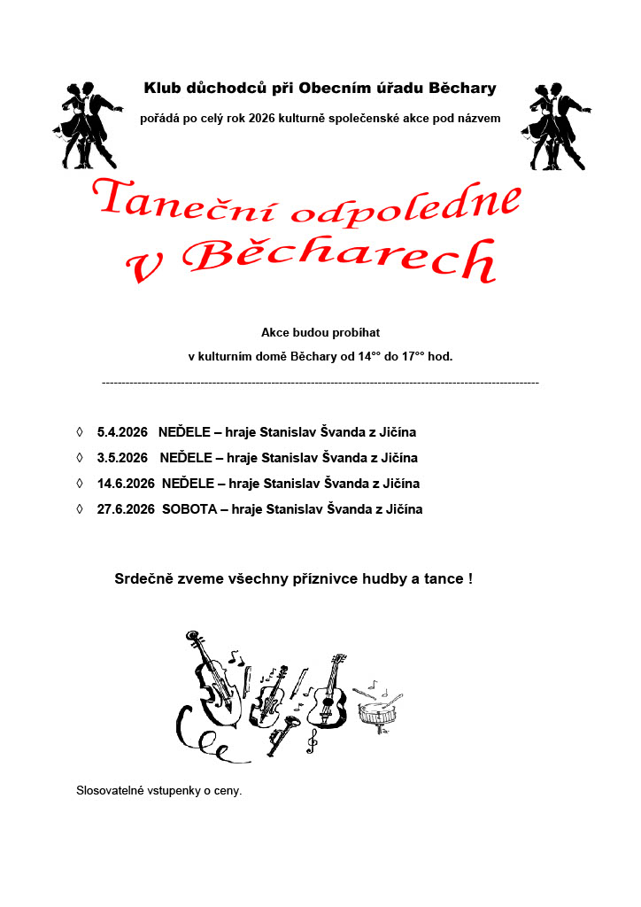 Klub důchodců při Obecním úřadu Běchary pořádá v roce 2026 kulturně společenské akce s názvem Taneční odpoledne. Akce se konají v kulturním domě Běchary, vždy v neděli a jednou v sobotu. K poslechu a tanci hraje Stanislav Švanda z Jičína. Na všechny akce jsou srdečně zváni příznivci hudby a tance. Pro návštěvníky budou připraveny slosovatelné vstupenky o ceny.